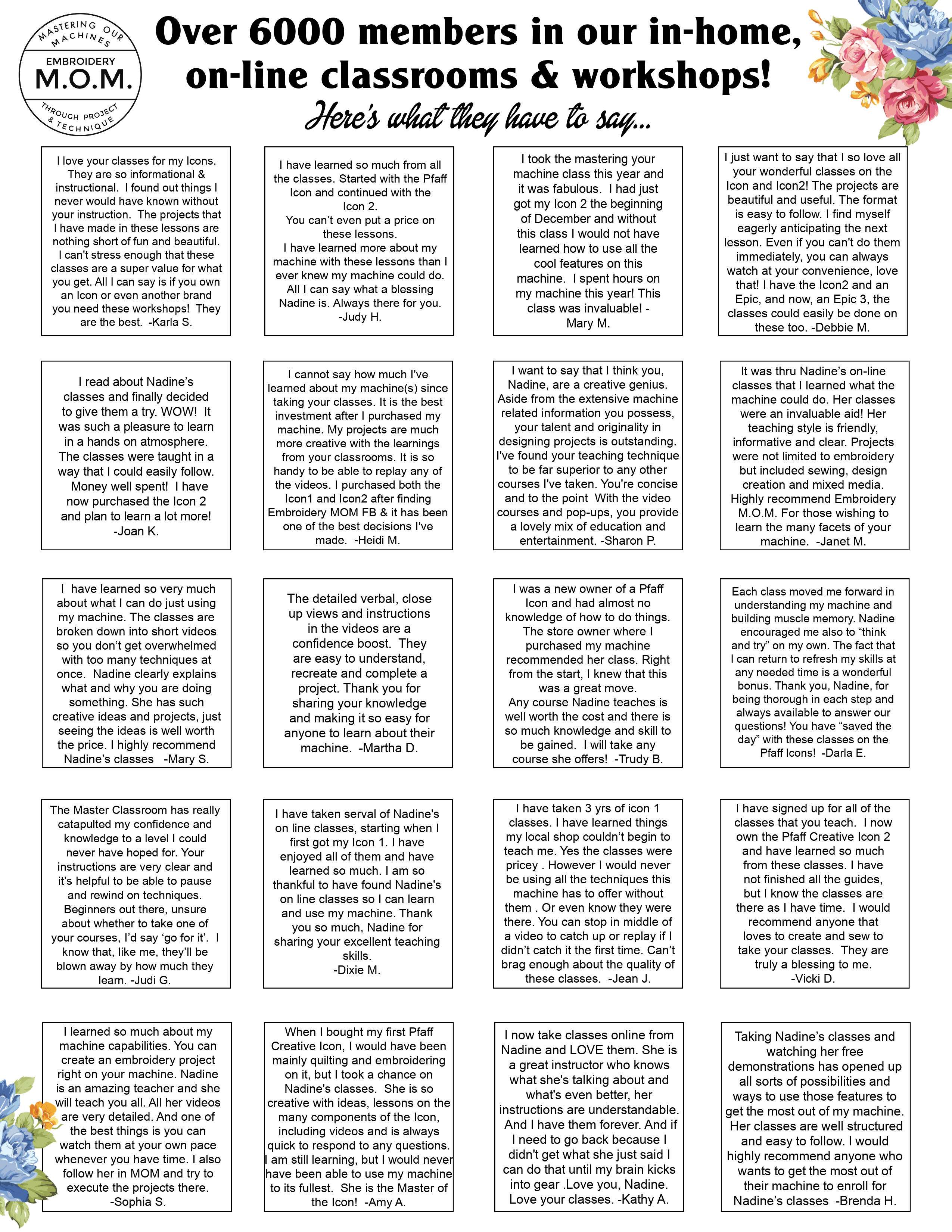 You will be sent a download file via email that contains a passcode. (If registering using recurring payment option, you will send an email to EmbroideryWithNadine@yahoo.com to get your access code.) When you request to join the FB classroom group you will be asked for a passcode. Entering this code simply tells our Admin that you are a paid registered member and you will be accepted into the group. Please do not share this information with unpaid members. Our classrooms kick off March 1st, 2024. We will be using the email address you used to register to add you to the group email list for updates & announcements.