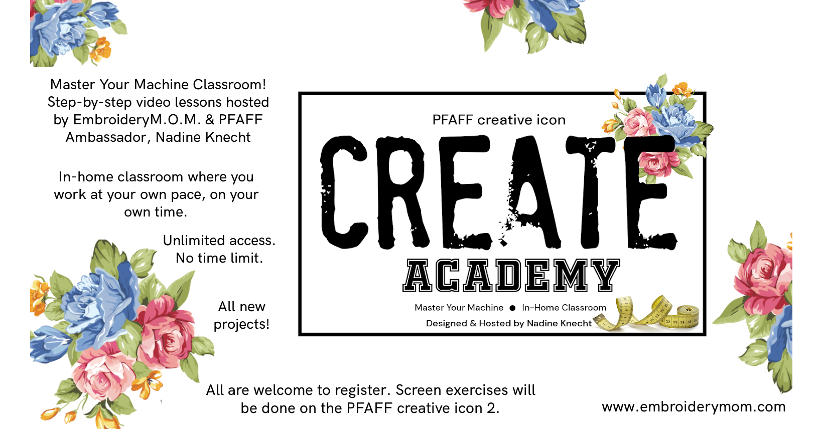 CREATE ACADEMY will be taught using the screens of the PFAFF creative icon 2. All machine owners are welcome to join. Past classroom members have successfully adapted and followed the classroom's step by step lessons to the original PFAFF creative icon1 models, & other machine models. If you have questions, please feel free to send us an email.